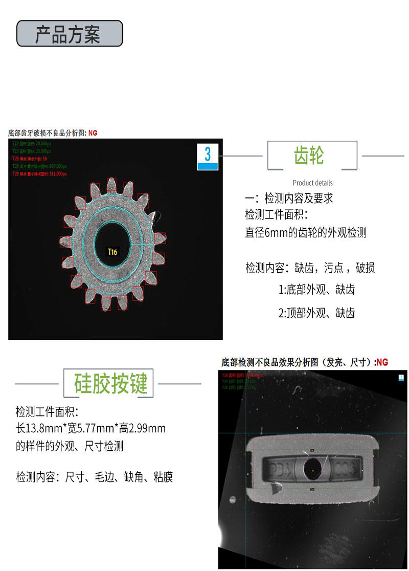 适用于检测可平稳放置的螺丝、螺母、车床件、冲压件、注塑件、冷镦件、电子元器件、橡胶硅胶件等。